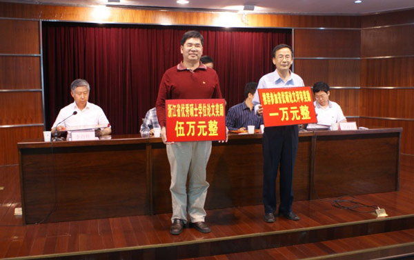 人事处处长王政贵代表学校宣读了奖励文件,根据《中国计量学院优秀硕士学位论文奖励办法》,决定授予葛洪良教授 “浙江省优秀硕士学位论文奖”,奖金5万元;授予刘天夫教授 “推荐参加省优秀硕士学位论文评审奖”,奖金1万元;授予苏中地教授 “2007年校优秀硕士学位论文奖”,奖金5千元。根据《关于对我校参加浙江省2007年硕士学位论文抽检成绩为“优秀”的学位论文奖励的决定》,对《有理逼近与插值网络逼近中的若干问题》等4篇学位论文的导师谢庭藩、杨汝月、孙燮华和曹飞龙4位教授给予奖励,奖金5千元。