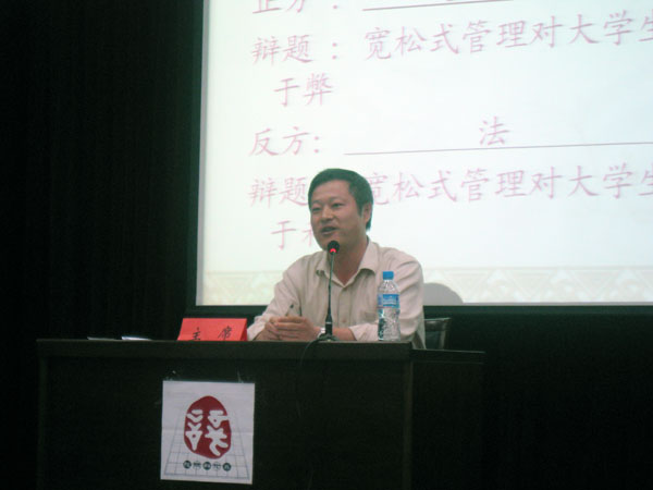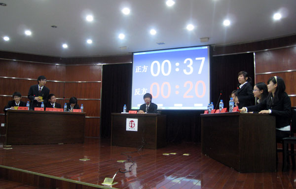 半决赛告捷的生命科学学院与法学院两支队伍会师当晚,一决高下。决赛的辩题为“宽松式管理对大学生是利大于弊还是弊大于利”。个性开场介绍双方辩手就表现不俗,妙语连珠。立论阶段双方势均力敌,不分伯仲。自由辩论中双方由虚入实,从灵活的管理方式升至没有规矩不成方圆的精神层面,唇枪舌剑,针尖对麦芒,展示了良好的辩论技巧与心理素质,博得了台下观众的阵阵掌声,体现了辩手们深厚的辩论功底和队友之间良好的团队协作精神。