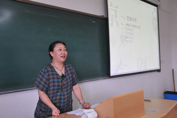 张明珠老师主要讲解了盖叫天艺名的来源,在京剧领域的艺术实践和成就,以及对艺术的追求等,反映了著名京剧武生盖叫天爱国爱党、忠贞不渝的艺术人生。通过盖叫天演出录像,分析了其代表作《武松打虎》等作品的艺术形象的创造,诠释了武生的种类,角色的行当等京剧基础知识。同学们随着张明珠老师一边讲解,一边播放的盖叫天演出剧照和毛泽东、周恩来等中央领导人的合影,以及张明珠老师跌宕起伏的演讲,让在座的师生为之感动,阵阵掌声不断。课堂上张明珠老师还演示了盖派创造的武生动作,同学们纷纷上台认真学习表演,课堂气氛热烈。师生们听了讲座后反映强烈,对京剧艺术产生了浓厚的兴趣。