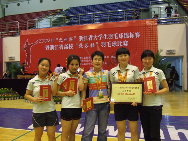 “九州杯”浙江省大学生羽毛球锦标赛于5月1至3日在杭州师范大学钱江学院举行,我校首次组队参加省大学生羽毛球赛,经过3天的激烈拼搏,获得女子甲组团体第二名,女子单打第三名,女双第八名的好成绩,为我校争得荣誉。