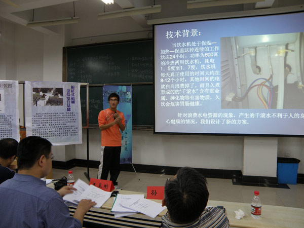在初次评审的基础上共有9件作品入选此次公开答辩,进行特等奖、一等奖、二等奖的角逐。此次公开答辩分为项目组汇报和专家提问两个环节,通过这两个环节,各位专家对参赛的各项目进行了认真的评审和点评打分。最终,“关于杭州市公共自行车节能减排效应的调查报告”凭借其独到的视角念获得了社会实践调查类一等奖,科技作品类,“利用电厂锅炉连续排污水余热的可移动蓄热装置”、“家庭型污水处理回用装置”和“新式太阳能看书台”赢得一等奖。本次大赛其他五件参赛作品也普遍得到了评委老师的认可,获得二等奖。