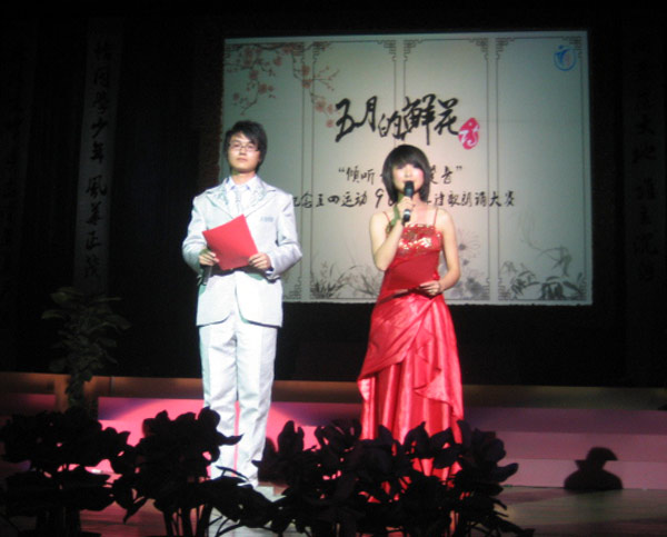 5月11日晚,嘉量大会堂灯火辉煌,人声鼎沸,由校团委、校学生会主办,量院之声广播台承办的“五月的鲜花——‘倾听青春的跫音’纪念五四运动90周年”诗歌朗诵大赛暨颁奖晚会在嘉量大会堂隆重举行。林建忠校长,党委委员、组织部部长陈希武以及各二级学院分管学生工作党总支书记等应邀出席了比赛。大赛邀请了学生处处长范庆瑜、党委宣传部副部长贾岳嵩,人文社科学院胡艺珊、机电工程学院王晓林等担任评委。