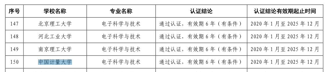 电子科学与技术专业分别于2013年、2017年通过首次认证及认证复查,此次是通过第3次认证,有效期6年。