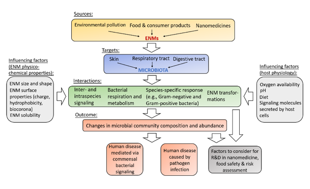人工纳米材料(ENMs)具有独特的理化特性,在食品、个人护理产品、农业、生物医学等领域已经得到广泛应用,导致人类和环境对ENMs的暴露逐渐增加。通过食物和个人护理品进入人体的ENMs不可避免地影响对人体健康和疾病起重要作用的共生微生物。但目前对于ENMs与微生物的相互作用机制及其潜在效应的研究还处于初始阶段,严重限制了ENMs的安全设计、风险评估及应用。近期,中国计量大学环境与健康科学研究院郭良宏团队成员在ENMs与微生物相互作用的机制研究方面取得重要成果。