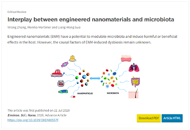 基于近年来的研究基础,团队成员张伊榕、Monika Mortimer、郭良宏共同撰写了题为“Interplay between Engineered Nanomaterials and Microbiota”的综述,今年7月在环境科学高影响力期刊Environmental Science: Nano 上发表
