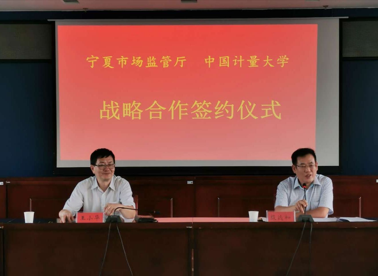 宁夏市场监管厅副厅长殷远和、一级巡视员胡鑫德,我校发展委员会副主任王小华出席签约仪式。殷远和介绍了宁夏回族自治区经济社会基本情况以及市场监管厅机构改革和工作开展情况。王小华介绍了学校概况和近年来双方在人才培养、教育培训、学术交流等方面合作开展情况。王小华和殷远和代表双方签约。双方各相关部门负责人对进一步合作进行了深入探讨交流。