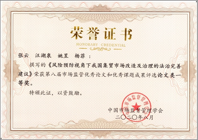 市场监管优秀论文和优秀课题成果奖由中国市场监督管理学会联合中国市场监管报社、中国经济周刊、中国知网等单位共同举办,以促进市场监管理论创新,表彰在推进市场监管治理体系和治理能力现代化中具有高度理论价值和较好实务贡献的研究成果为目的。全国共有十三篇论文获得一等奖。张云教授团队在计量法、产品质量法、食品安全法、标准化法等领域开展了大量的实务和理论研究,为市场监管系统各级实务部门提供了有力的智慧支持。