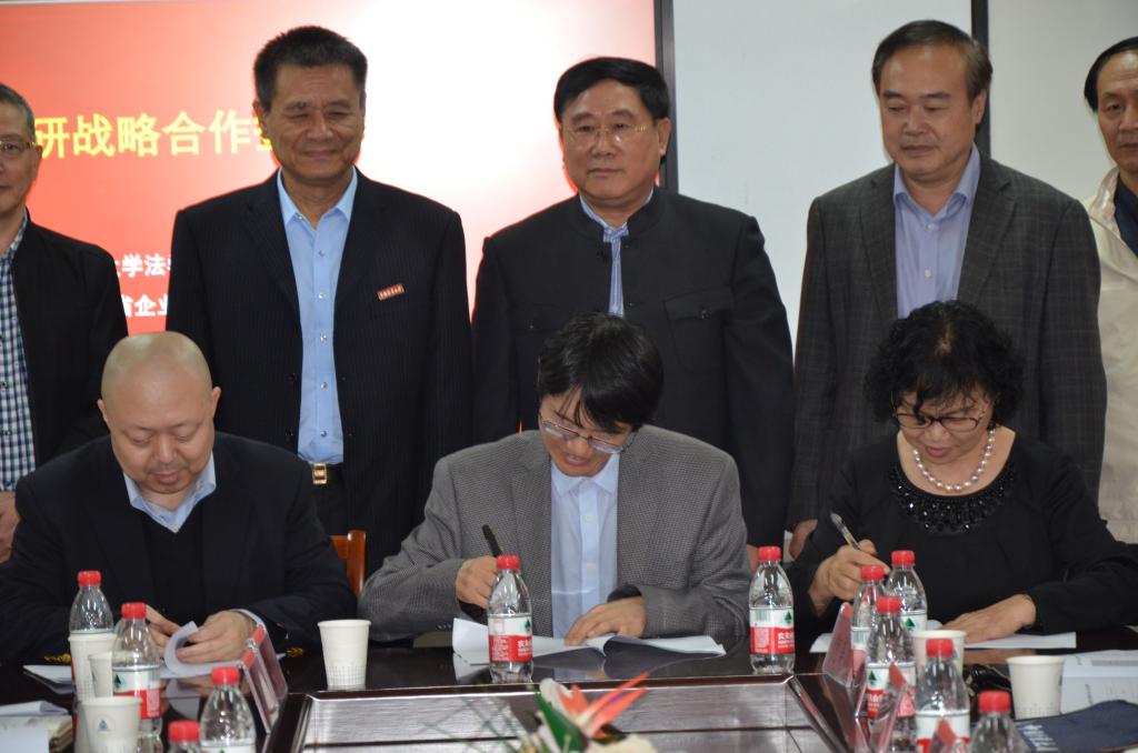 在胡建成、姚季鑫、李振华、陈桓、杨忠智的见证下,陈永强代表中国计量大学法学院、与浙江省企业法律顾问协会代表张健、浙江省总会计师协会代表俞乐平共同签署了合作协议。