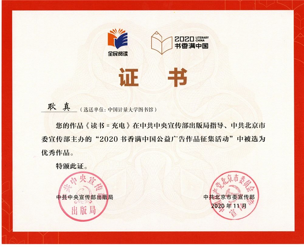 同时,中宣部新闻出版局指导、中共北京市委宣传部主办的“2020年书香满中国公益广告征集活动”,首次面向全国开展关于全民阅读的公益广告征集,该活动从第二届全国“图书馆杯”主题图像创意设计征集作品中选取部分作品入展,我校耿真同学作品《读书=充电》喜获“2020年书香满中国公益广告征集活动”优秀作品奖。