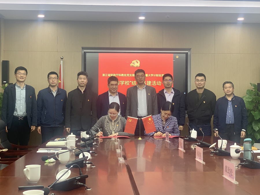 最后,在葛洪良副校长、虞劲松副处长等领导和支部党员代表共同见证下,浙江省财政厅科教处党支部书记童黛铭与中国计量大学计财处党支部书记郭慧丽共同签署了支部“清廉学校”结对共建协议书。在“十四五”期间开展党支部结对共建活动,从强化学校预决算管理、加强制度建设和绩效管理共同推进“清廉学校”建设。