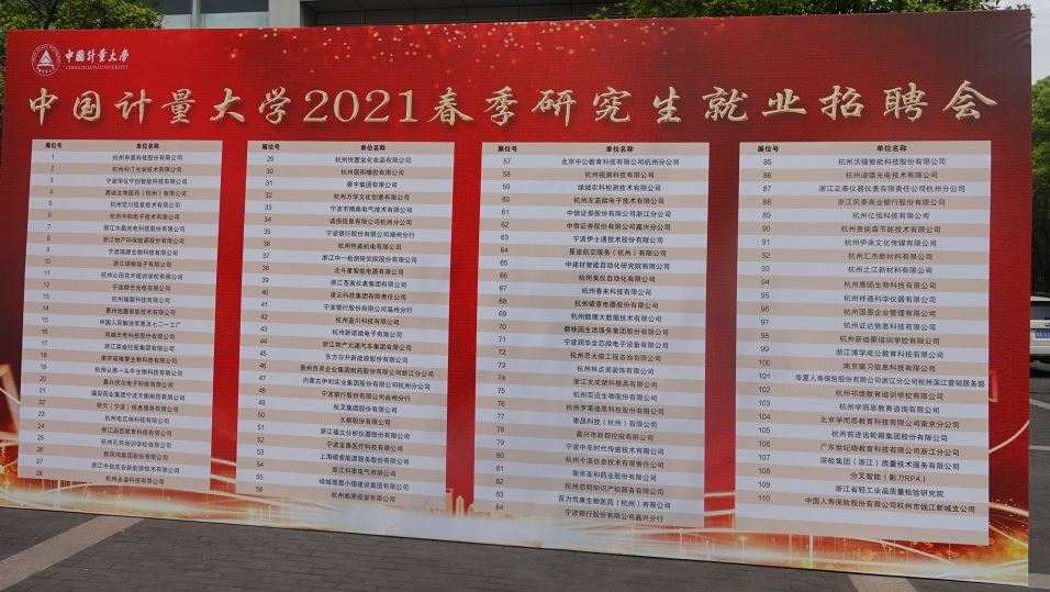 为营造良好的研究生就业氛围,搭建用人单位与毕业生之间的双选平台,促进2021届毕业研究生充分就业。在相关部门和各学院的大力支持下,4月21日我校在天健体育馆举办了“2021年中国计量大学春季研究生就业招聘会”。