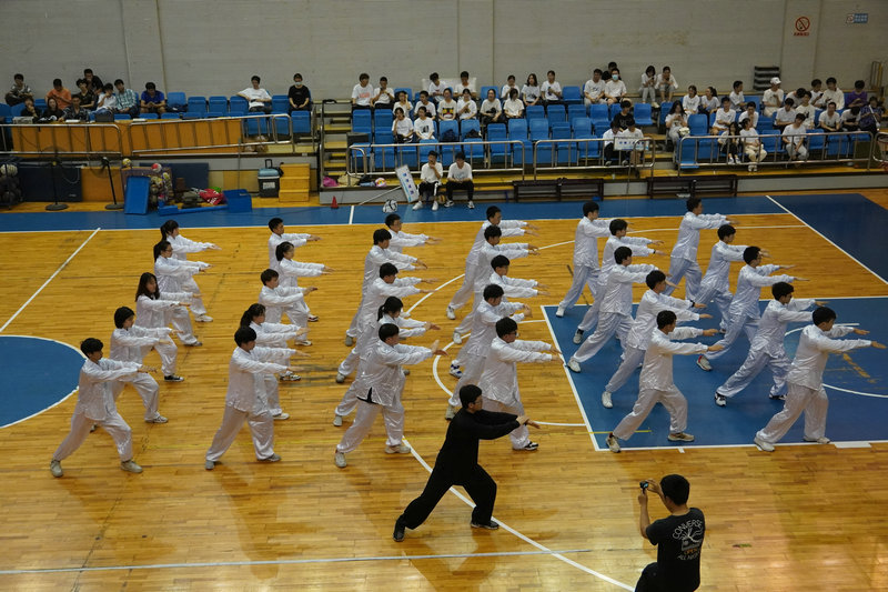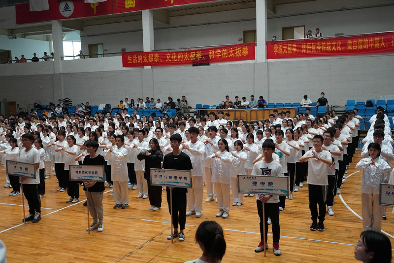 随着现场节奏欢快的拉拉操和平静的瑜伽这一动一静的表演,现场所有参赛选手逐渐进入到比赛状态,13支学院代表队两队一组逐一进行了展示角逐。身着统一服装,随着音乐缓慢起落,一招一式,如行云流水,刚柔并济,尽显太极神韵……。综合评分之际,《太极拳》课程组的老师们为大家集体表演了太极拳,学校武术队的队员们也为大家进行了武术套路表演。