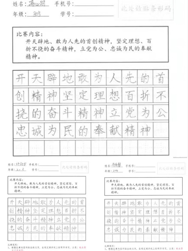 开天辟地、敢为人先的首创精神,坚定理想、百折不挠的奋斗精神,立党为公、忠诚为民的奉献精神,红船精神内涵丰富、寓意深远。学生们端坐在书桌前,聚精会神地书写红船精神内涵,一横一竖、一撇一奈,伴着笔尖划过的沙沙声,一个个端正、娟秀的汉字呈现在专用书写纸上。