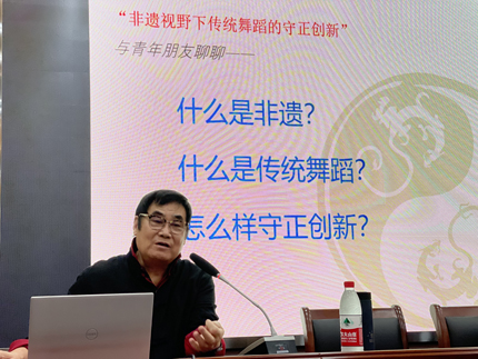 吴露生围绕非遗传统舞蹈这个主题,讲述了非物质文化遗产的概念、非物质文化遗产的保护和保存、非遗视野下传统舞蹈的守正创新等三个问题,提出了新时代传统舞蹈创造性转化的主要特征:保留传统舞蹈的“基因”;注重文物、文献与田野调查;注重创新,在传统的根脉上注入时代的活力;符合观众的审美观念与审美理想;并以原生态民间舞“长兴百叶龙”、民间舞优秀典范《黄土黄》和古典舞经典《踏歌》为例,阐明了传统舞蹈创造性转化的必要性和重要意义。最后,吴露生以一首诗歌“了解原始的美,让古老的远行抵达至今,抵达心灵”结尾,与大家共勉。