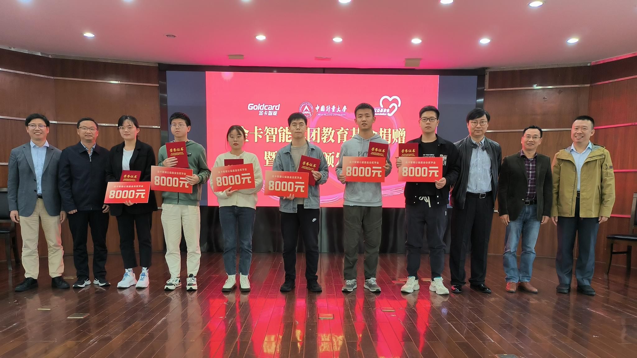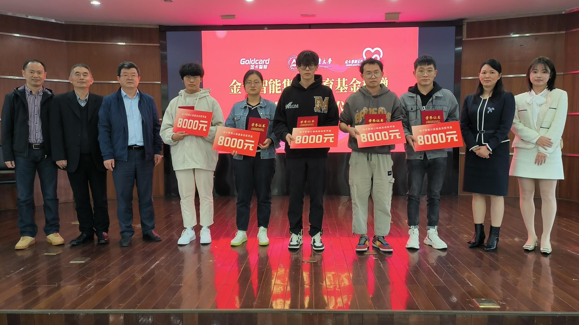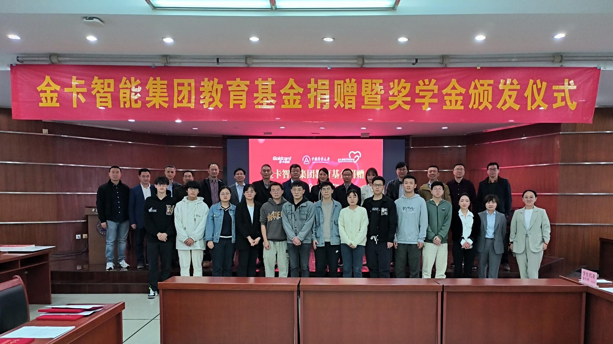 会上,金卡智能公益基金会向我校捐赠90万元用于支持学生成长发展。孔明宣读了金卡智能奖学金的获得者名单,他鼓励获奖同学再接再厉、再创佳绩,参会领导共同为获奖学生颁发证书。