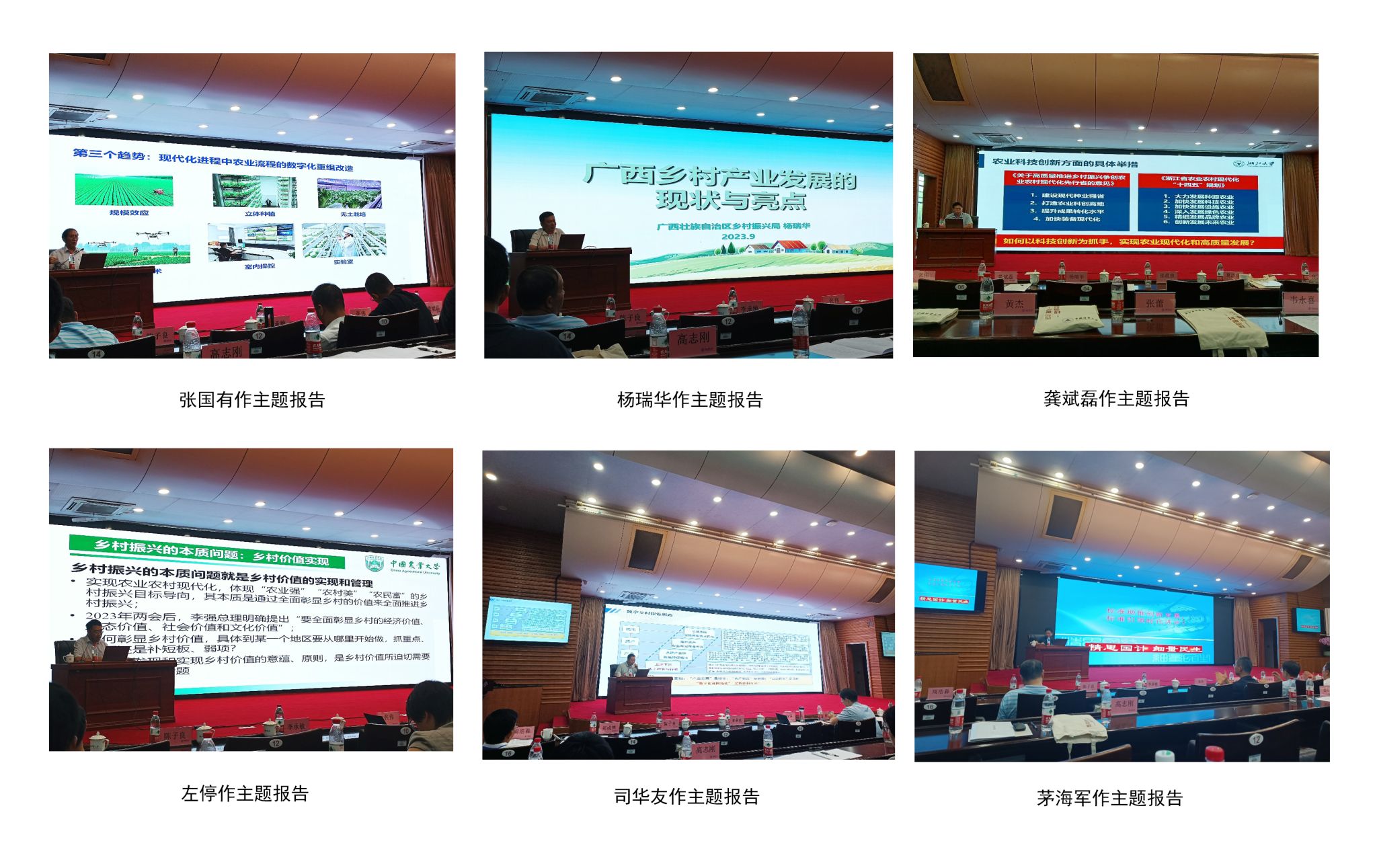六位乡村振兴领域的领导和专家围绕中外乡村发展趋势,广西乡村产业发展历程,科技创新与农业高质量发展的关系,乡村价值的内涵、原则与路径,数字乡村建设思想、方法、标准体系等问题展开深入探讨,为与会者描绘出中国乡村振兴的发展蓝图,展示了近十年的相关研究及建设成果,点明未来攻关的重点和实现路径,鼓励在座学者和科研人员积极为我国乡村振兴贡献力量。