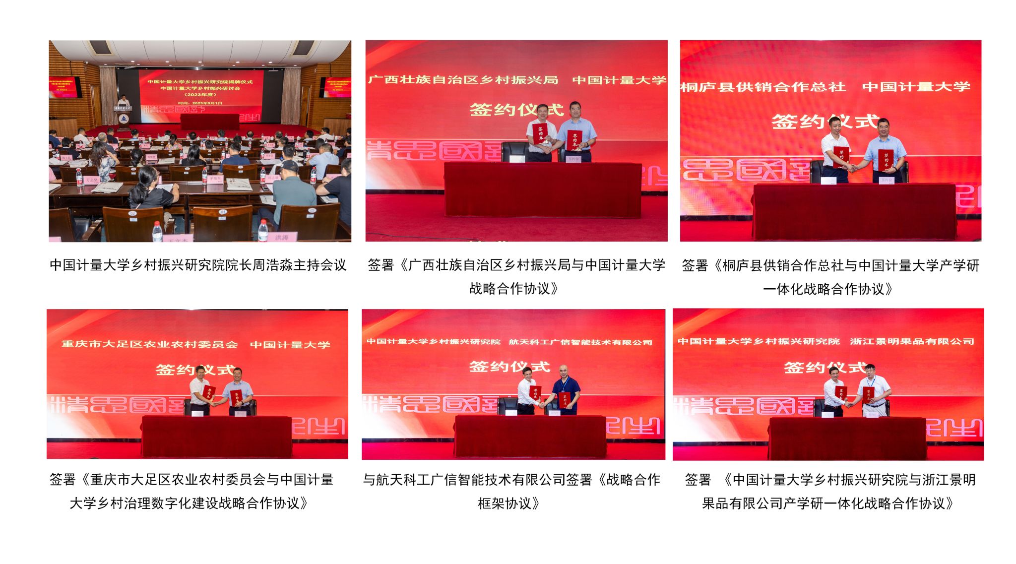仪式上,中国计量大学与广西乡村振兴局签署《广西壮族自治区乡村振兴局与中国计量大学战略合作协议》,与重庆市大足区农业农村委员会签署《重庆市大足区农业农村委员会与中国计量大学乡村治理数字化建设战略合作协议》,与桐庐县供销合作总社签署《桐庐县供销合作总社与中国计量大学产学研一体化战略合作协议》。中国计量大学乡村振兴研究院与航天科工广信智能技术有限公司签署《战略合作框架协议》,与浙江景明果品有限公司签署《中国计量大学乡村振兴研究院与浙江景明果品有限公司产学研一体化战略合作协议》。