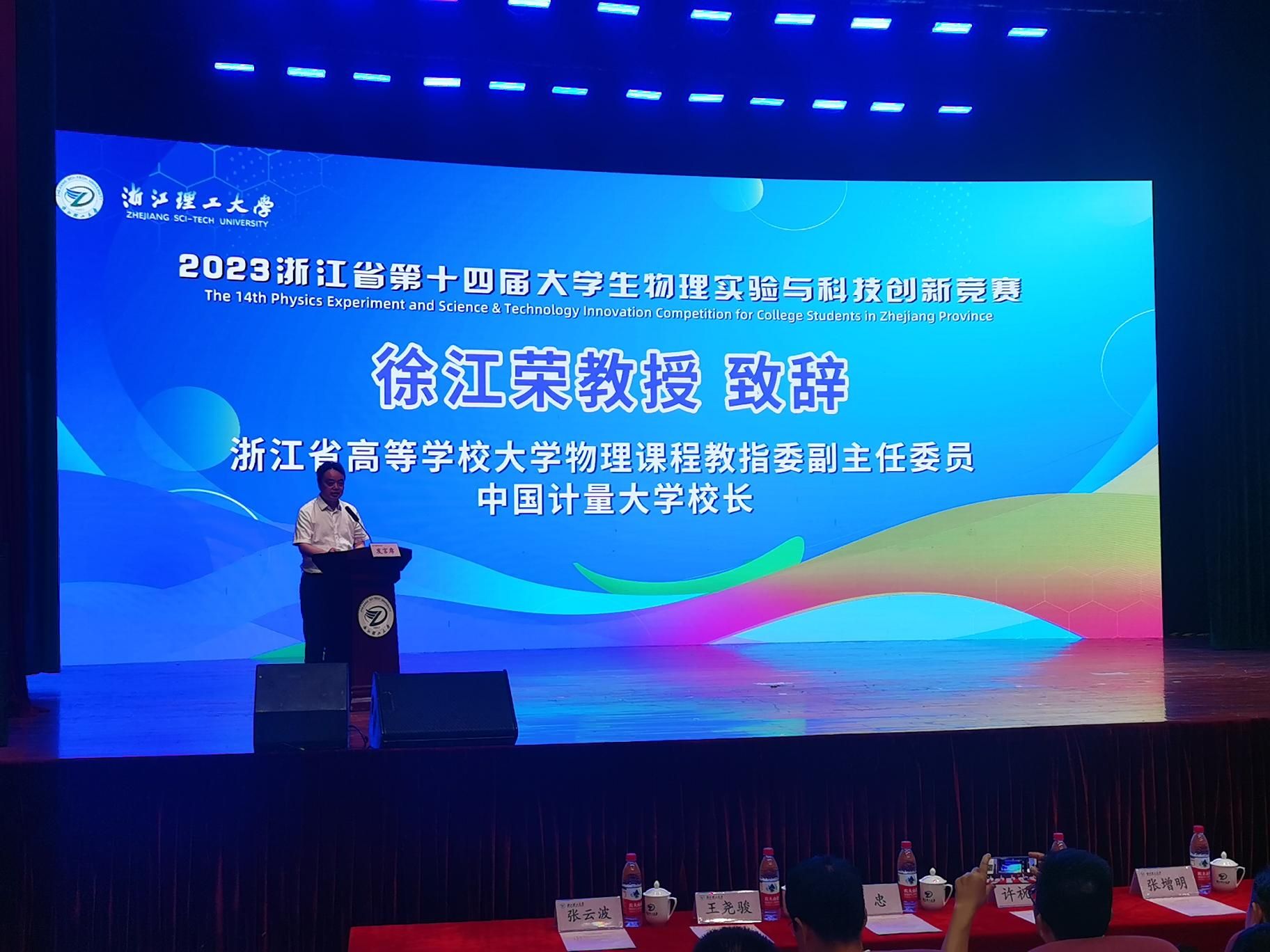 本次竞赛由浙江省大学生科技创新竞赛委员会主办,浙江省高等学校大学物理课程教学指导委员会、浙江省物理学会承办。徐江荣校长代表浙江省高等学校大学物理课程教学指导委员会发言。徐校长回顾了大学生物理实验与科技创新竞赛的发展历史,介绍了本次竞赛的具体情况,希望通过竞赛平台以赛促教、以赛促学、以赛促创。