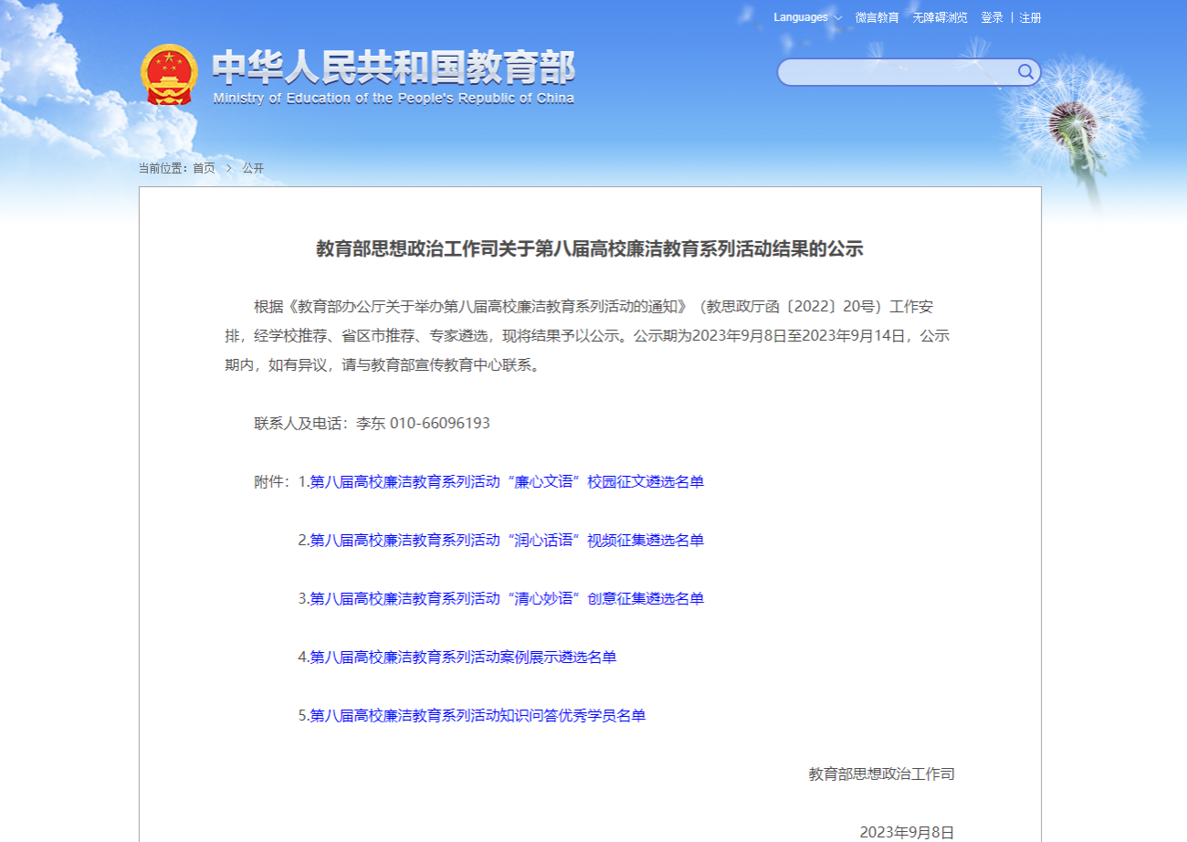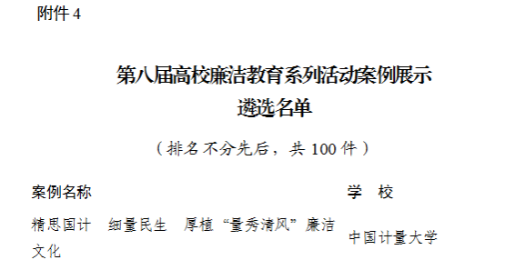 根据《教育部办公厅关于举办第八届高校廉洁教育系列活动的通知》(教思政厅函〔2022〕20号)工作安排,经学校推荐、省区市推荐、专家遴选,我校提交的《精思国计 细量民生 厚植“量秀清风”廉洁文化》荣获第八届高校廉洁教育系列活动案例展示遴选名单,全国共有100所高校获得此项荣誉。