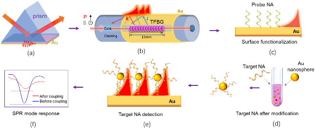 图1. (a)基于棱镜的表面等离子共振示意图;(b)基于倾斜光纤光栅的表面等离子共振装置原理图;(c)探针核酸在镀金倾斜光纤光栅上的表面功能化;(d)金纳米颗粒和靶核酸之间的结合;(e)探针和镀金倾斜光纤光栅的靶核酸的耦合;(f)探针和靶核酸偶联前后的光谱示意图;(g)倾斜光纤光栅的金表面上的核酸的示意图和分子结构图。