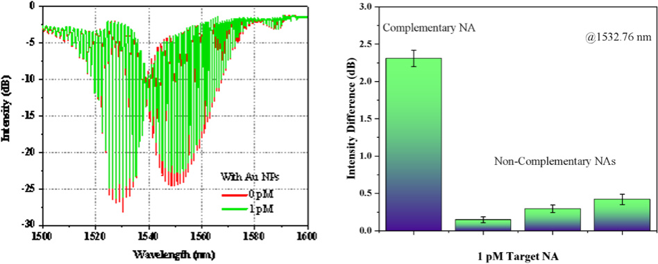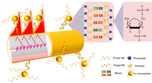 众所周知,倾斜光纤光栅可以激发众多的包层模式,并且对光纤表面周围环境敏感。当光纤包层模式与表面等离子共振相位匹配时,倾斜光纤光栅可以在金表面激发倏逝表面等离子体共振波。然而,这些表面等离子波对光纤周围的折射率敏感度大约在10-6至10-7 RIU。对于碱基对较少的核酸(例如长度约为6-7 nm的核酸),其折射率灵敏度无法满足核酸检测。基于此,本研究在引入待测核酸样品之前,在核酸单链的3或5端使用硫醇有机化合物将目标核酸结合到金纳米颗粒上。当金纳米颗粒标记的靶核酸被吸引到探针核酸时,附着的金纳米颗粒也被金膜表面“抓住”,这导致引起金膜表面折射率的局部扰动,实现金膜表面等离子共振的增强,并且能够实现较低核酸浓度检测。