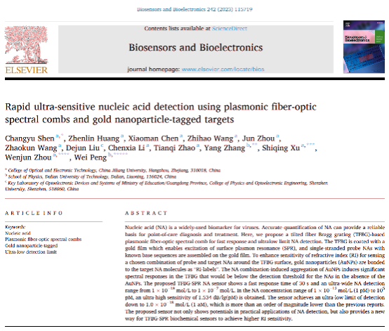 近日,我校光学与电子科技学院沈常宇教授、周文俊研究员课题组报道了一种基于表面等离子体光纤光谱梳和金纳米颗粒标记的快速超灵敏核酸传感器,相关成果以“Rapid ultra-sensitive nucleic acid detection using plasmonic fiber-optic spectral combs and gold nanoparticle-tagged targets”为题发表在传感器领域TOP期刊Biosensors and Bioelectronics上(影响因子12.6,中科院1区)。