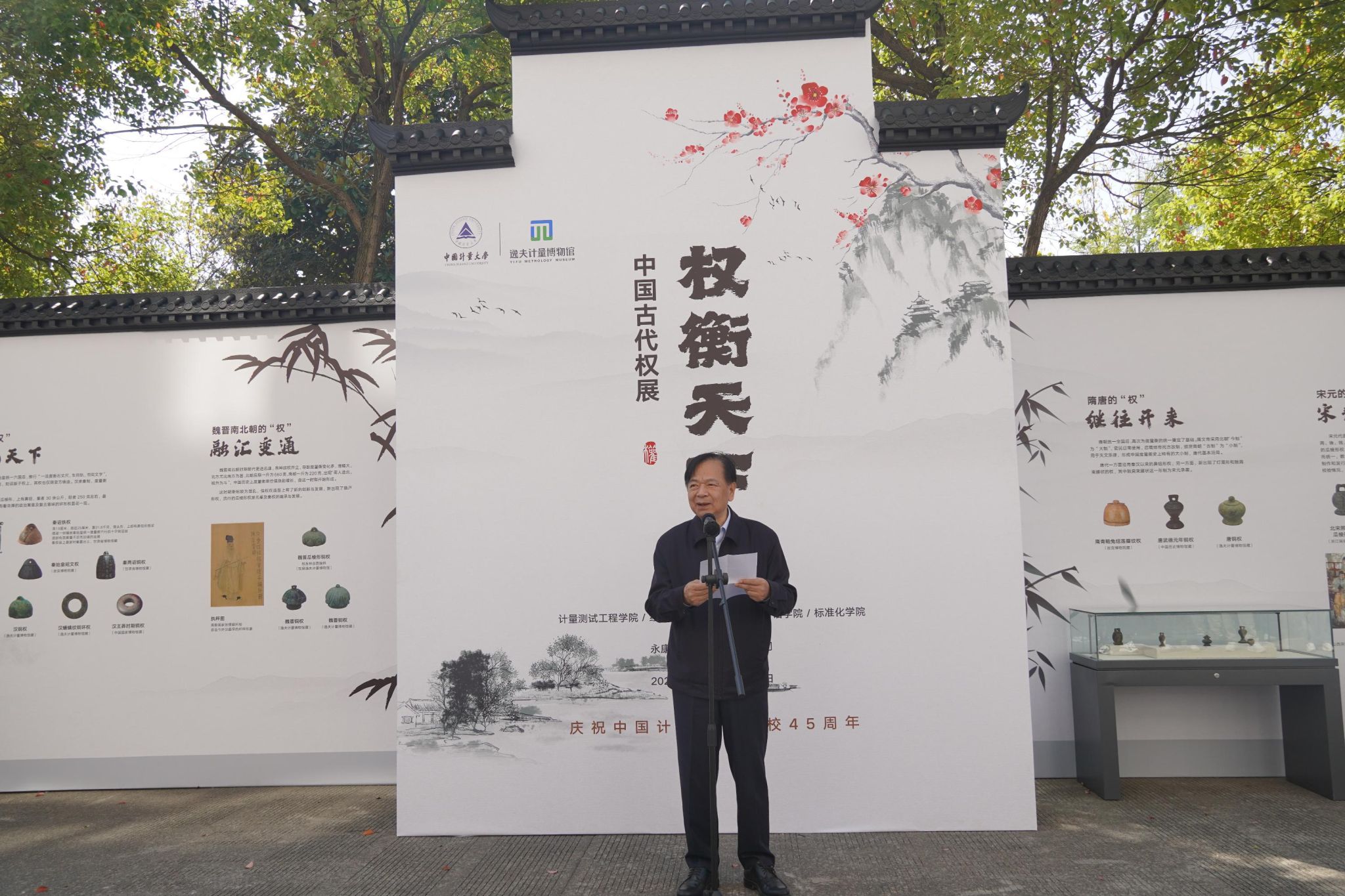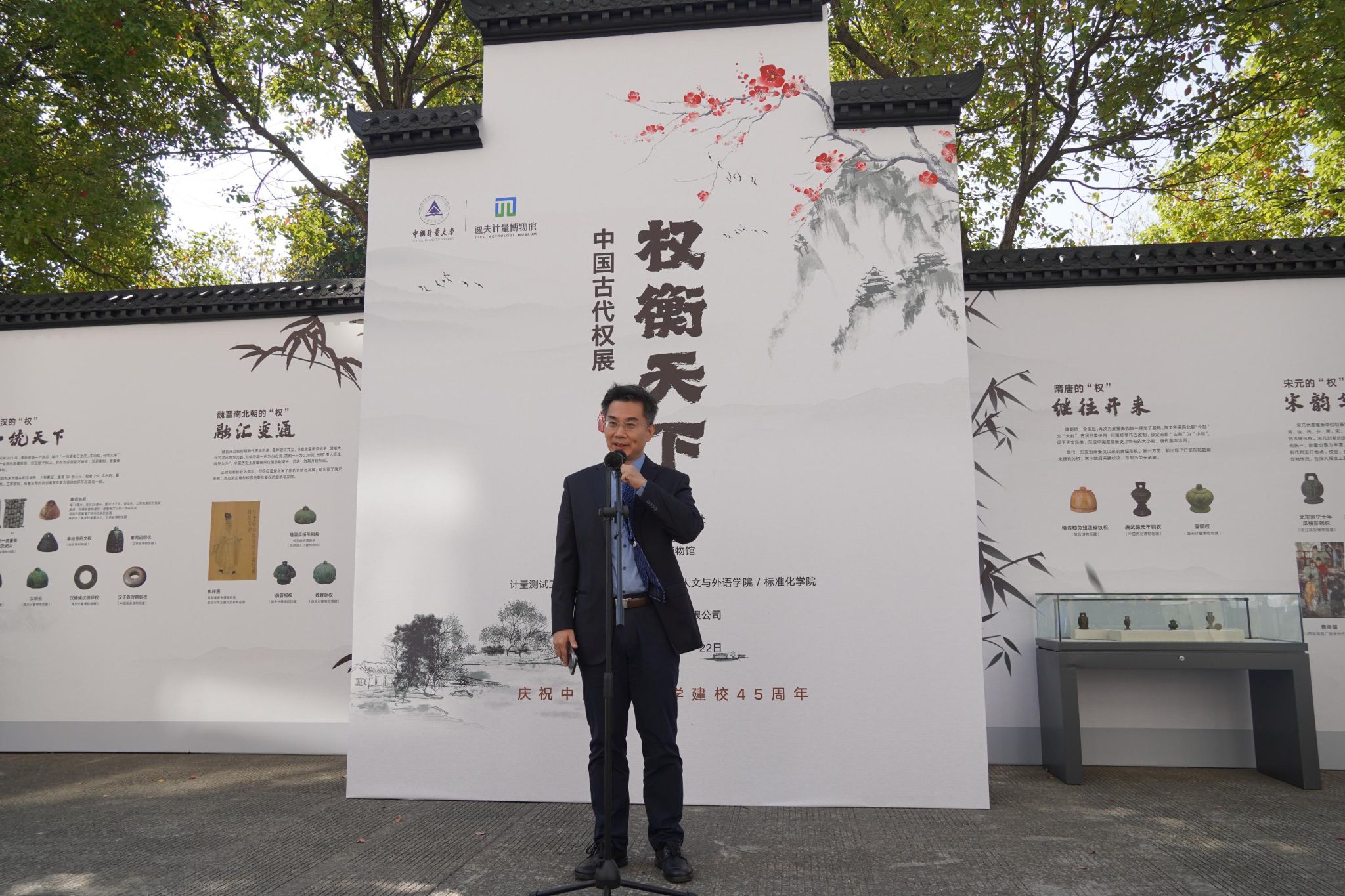 中国计量大学副校长王斌锐为开幕式致辞,他指出,作为世界上唯一以计量命名的本科院校------中国计量大学,45年薪火相传,赓续辉煌,一代代量大人在实干奉献中诠释着“精思国计、细量民生”的校训,熔铸“计量文化”的核心价值以及使命担当。逸夫计量博物馆依托丰富的计量文物藏品资源,围绕“彰显特色、弘扬学术、凝聚力量、促进发展”的校庆主题,开展“权衡天下——中国古代权展”是学校把“计量”特色全方位渗透于文化校园建设全过程的体现,在新时代校园文化建设要进一步深入挖掘计量文化,充分发挥以文化人、以德润身的文化教育功能。