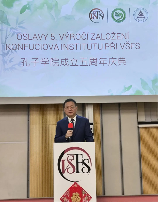 11月14日,我校共建的布拉格金融管理大学孔子学院在捷克首都布拉格隆重举办建院五周年庆典活动,中国驻捷克大使冯飚、使馆教育事务负责人蒋宇鹏、捷中友好协会副主席Petr Mrhálek、布拉格金融管理大学校长兼董事会主席Bohuslava Šenkýřová、董事会副主席Emil Šenkýř、副校长Petr Budinský、我校副校长王斌锐等领导出席庆典现场。中国国际中文教育基金会副理事长、秘书长赵灵山发来贺信,布拉格金融管理大学师生代表、孔子学院师生代表、捷克华人华侨代表、中资企业代表、新闻媒体及社会各界人士200多人参加庆典活动。