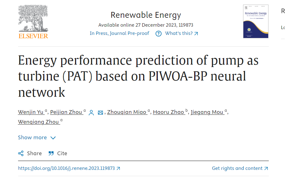 近日,中国计量大学计量测试工程学院周佩剑副教授题为“Energy performance prediction of pump as turbine (PAT) based on PIWOA-BP neural network”(基于PIWOA-BPNN模型的泵作透平性能预测方法)的研究论文在能源领域权威期刊Renewable Energy (IF 8.7,中科院1区)在线发表。通讯作者为周佩剑副教授,第一作者为本校研究生余文进。