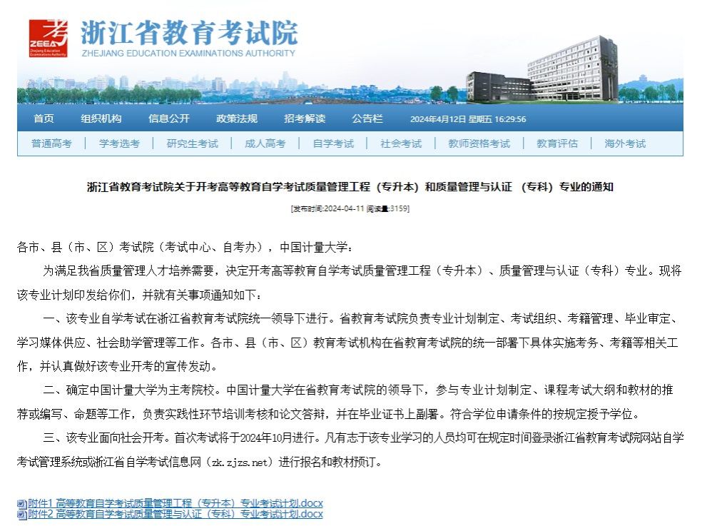 4月11日,经教育部同意,浙江省考试院决定在我省开考“质量管理工程”“质量管理与认证”等两个高等教育自学考试专业,同时确定我校为浙江省主考学校。