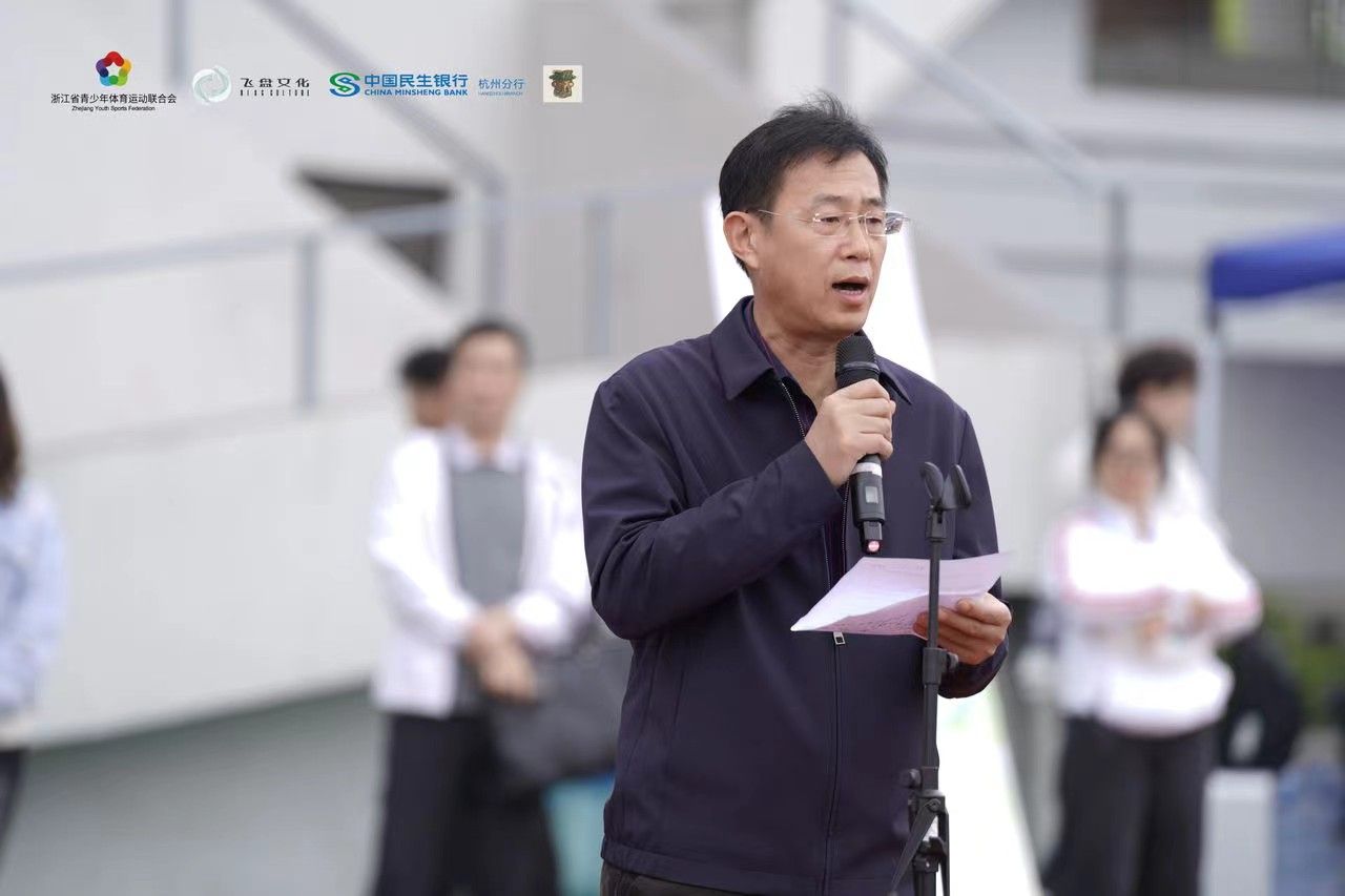 王新庆在致辞中首先对来自全省各学校的运动员表示热烈欢迎。他指出,飞盘运动作为一项新兴的体育项目,受到了广大学生的热烈追捧,在省内各学校中迅速普及。本次比赛作为浙江省首届青少年飞盘锦标赛,旨在推动飞盘运动在校园的普及与发展、提升飞盘运动的竞技水平,同时也为广大学生提供一个展示自我、挑战自我的平台。他最后预祝本次比赛圆满成功。