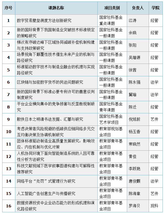 近日,2024年度国家社会科学基金年度项目、教育部人文社科研究项目相继公示或公布立项名单。本年度,我校共获批9项国家社科基金年度项目,其中重点课题1项、一般课题6项、青年课题1项、艺术学项目1项;获批教育部人文社科研究项目7项,含规划基金项目1项、青年基金项目6项。立项项目涵盖管理学、应用经济学、法学、艺术学、区域国别学和国际问题研究、交叉学科等研究领域,具体名单如下: