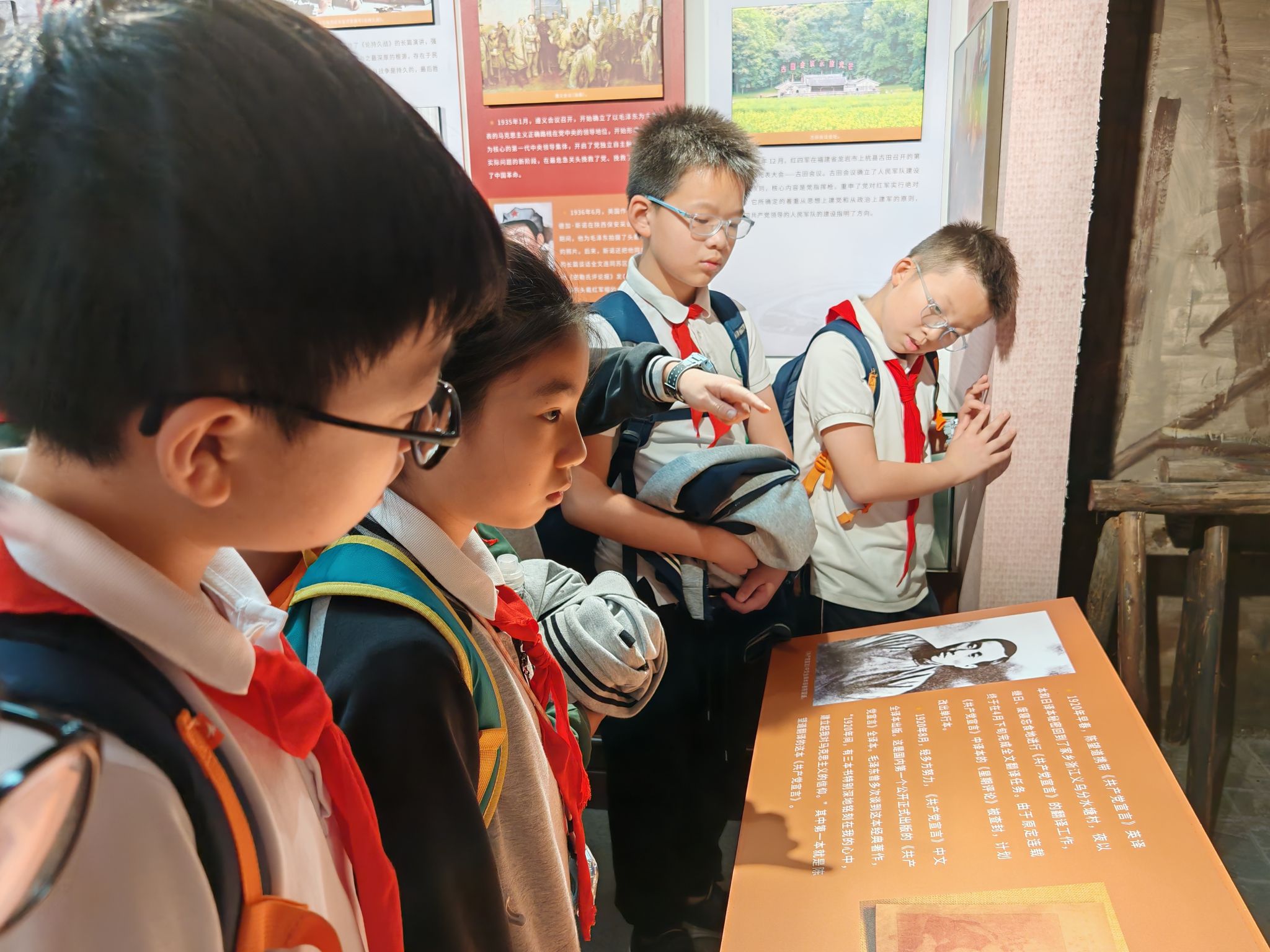 在陈望道翻译《共产党宣言》的实景前,同学们认真听着“真理的味道有点甜”的故事,久久伫立,深受触动,“这个故事已经深深印在我的脑海里了。”“研究生姐姐讲得很生动,我真的被陈望道的故事感动了。”