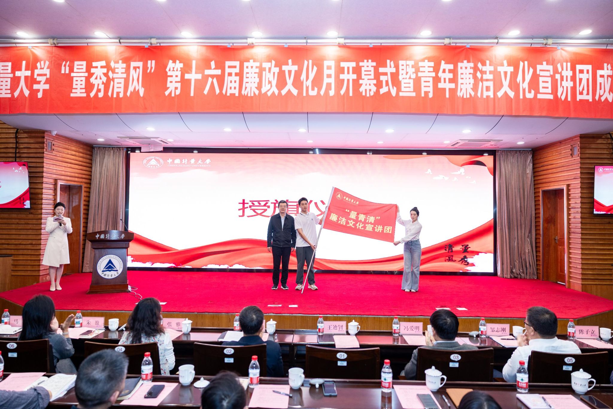 校党委副书记王迪钊授予了“量青清”廉洁文化宣讲团团旗。这面旗帜的传递,不仅标志着宣讲团的正式启航,更承载着学校党委对青年一代传承廉洁精神、弘扬清风正气的殷切期盼。校团委书记朱盈宣布“量青清”青年廉洁文化宣讲团正式成立,简要介绍了宣讲团的组建背景、成员构成和主要职责。校纪委委员依次为宣讲团首批成员颁发聘书并赠送廉洁文化主题书籍。宣讲团成员代表陈卓同学作表态发言,表达了恪守廉洁底线、积极履职奉献的坚定决心。