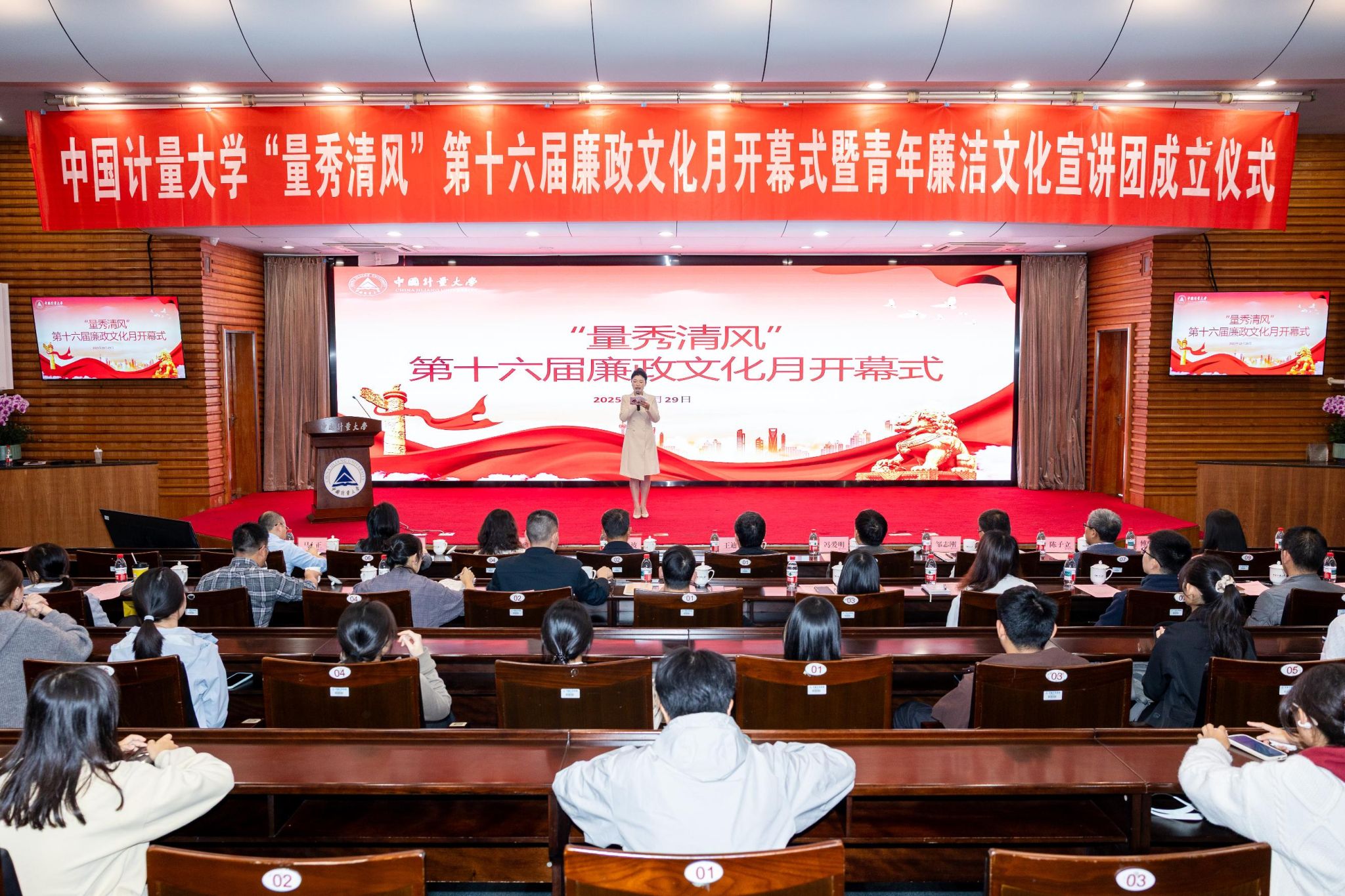 10月29日下午,中国计量大学“量秀清风”第十六届廉政文化月开幕式暨青年廉洁文化宣讲团成立仪式在闻厅二楼报告厅举行。校党委副书记王迪钊、校纪委书记马春波,校纪委委员,各二级单位纪委书记,纪检监察室、校团委,以及新成立的“量青清”青年廉洁文化宣讲团全体成员和学生代表参加开幕式。