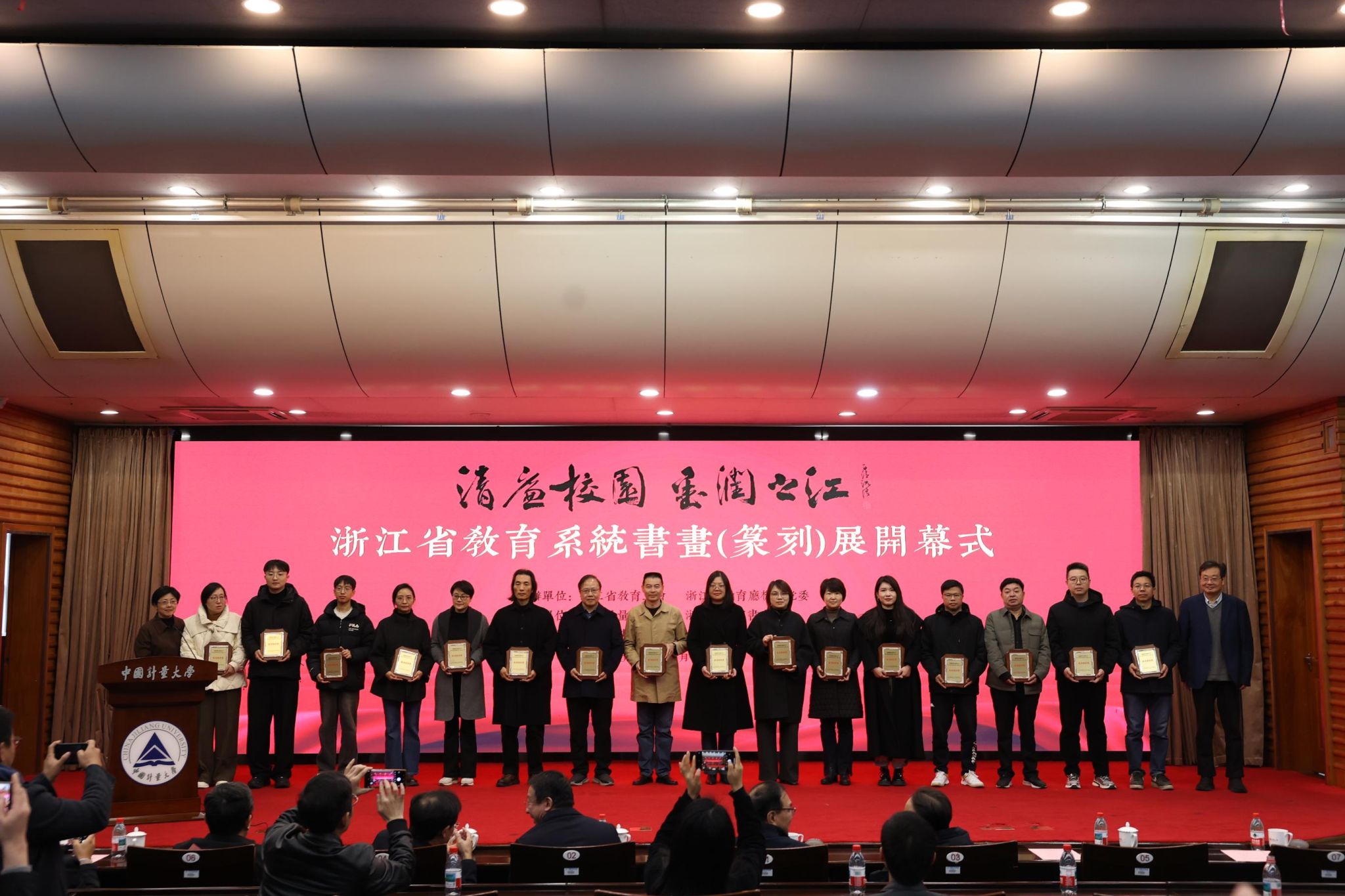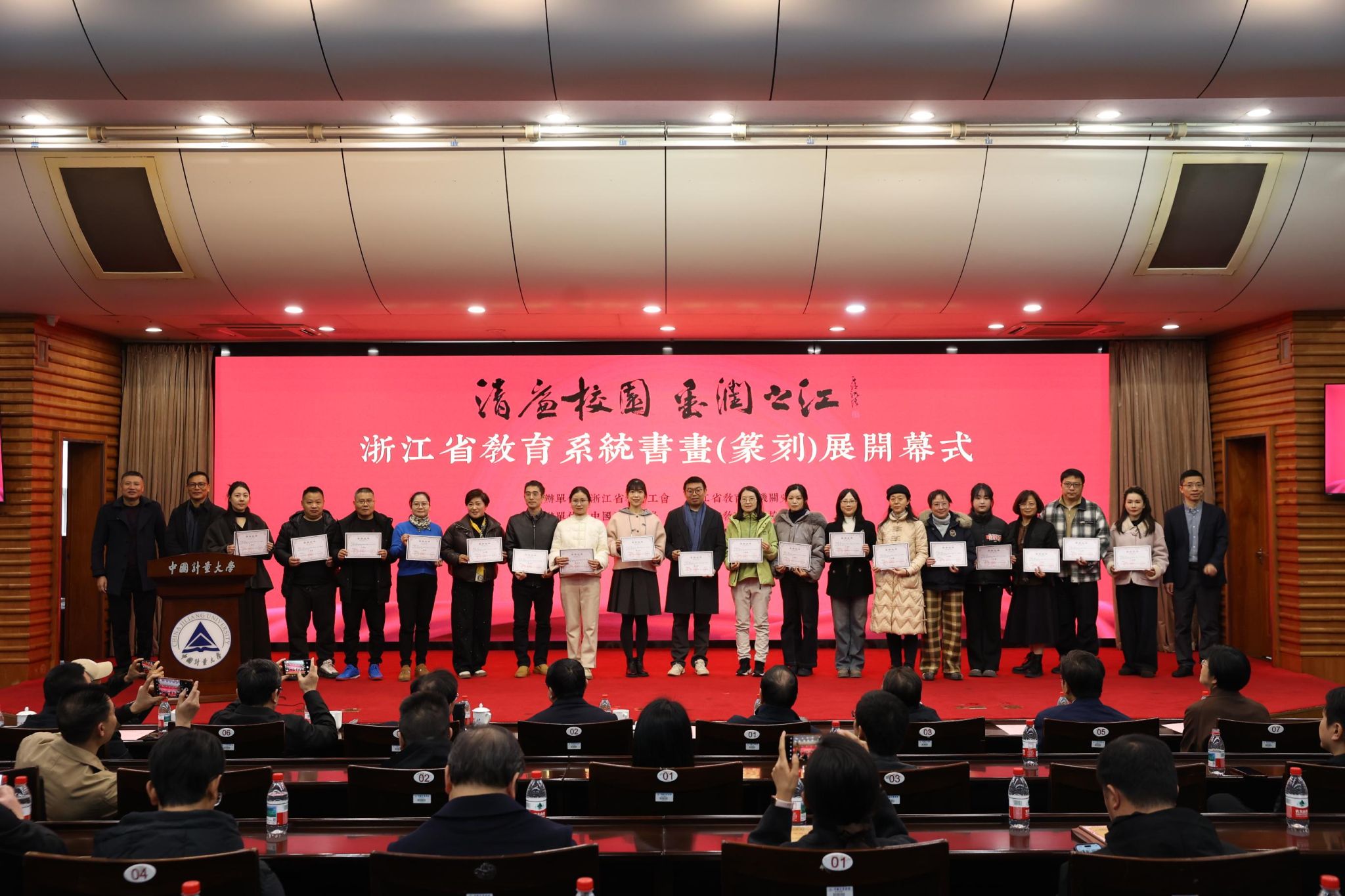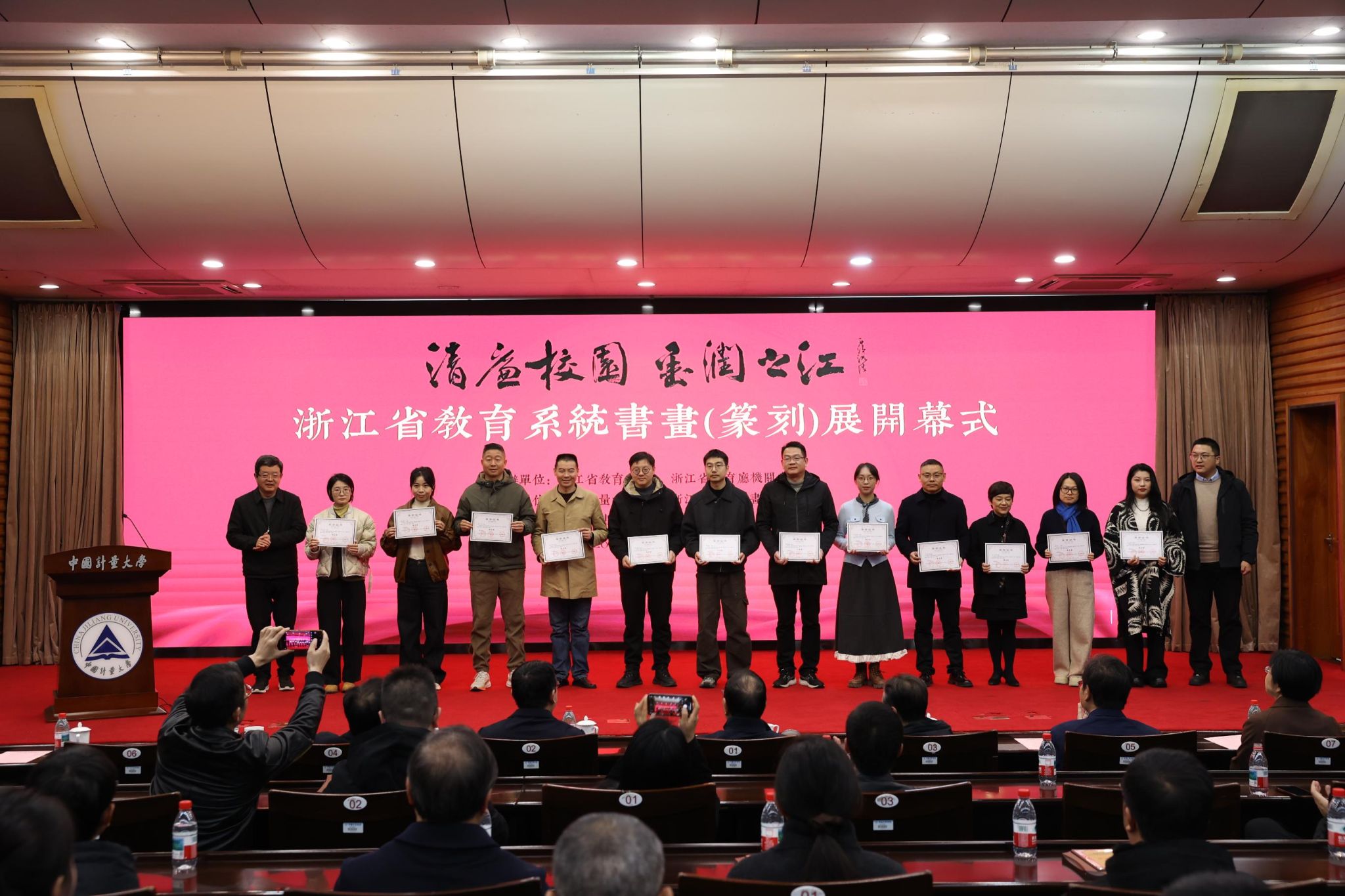 12月16日,“清廉校园•墨润之江”第十一届浙江省教职工书画(篆刻)展在我校闻厅正式拉开帷幕。浙江省总工会常委、二级巡视员、省教育工会主席王玉庆,校党委书记徐江荣,校党委副书记程刚、王迪钊,省教育厅机关党委专职副书记、纪委书记葛海龙,省教育书画协会会长黄建新,省教育宣传中心主任薛平等出席,办公室、工会、校教职工书画协会等相关单位负责人参加开幕式并参观了展览。来自全省各地九十余家单位的一百多名师生代表汇聚现场,一同见证了这一文化盛事。