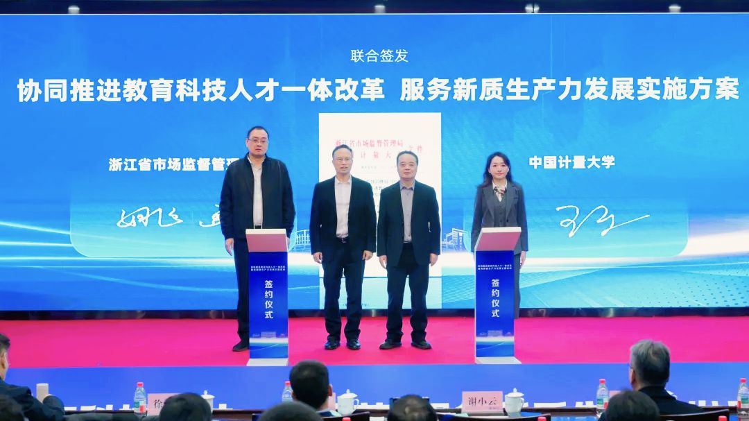 12月25日下午,我校与浙江省市场监督管理局在闻厅二楼报告厅共同举办“协同推进教育科技人才一体改革,服务新质生产力发展”主题活动。省市场监管局党委书记、局长谢小云,省教育考试院党委委员、院长徐继彬,省科技厅党组成员、副厅长楼学军,学校党委书记徐江荣,党委副书记、副校长(主持行政日常工作)戴道锌,副校长王斌锐、王新庆、王乐、夏昶祺出席活动。省市场监管局党委委员、副局长姚画主持活动。